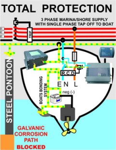 Al conectar la red eléctrica de 220v a nuestra embarcación también queda unido el cable de tierra del amarre con el casco, bloque motor, zincs, hélices, etc.