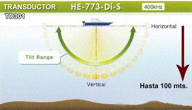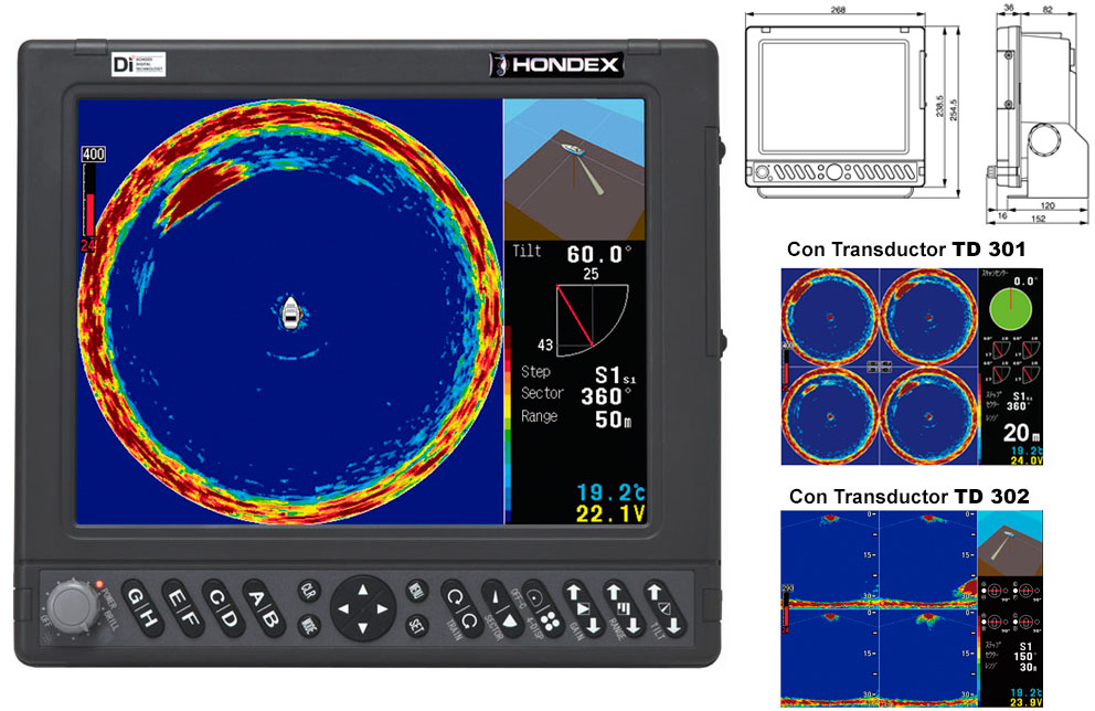Este sonar es ideal para pesca de bajura (anchoa, sardina, caballa), atún... Con un sonar como este podrás pescar más y con una localización de las capturas más precisa, por lo tanto eso permitirá a los usuarios ahorrar combustible. Diversos modos de exploración. Diagrama de sondeo longitudinal (desde 0º a 178,2º). Modo sondeo cónico 60º/90º o 120º en modo sonar. Pantalla cuadruple para ver la evolución progresiva de la exploración del sonar. ¡Función exclusiva de Hondex! Muy sencillo de usar. Funcionand en Japón desde hace más de 2 años en gran cantidad debuques.Barrido longitudinal.